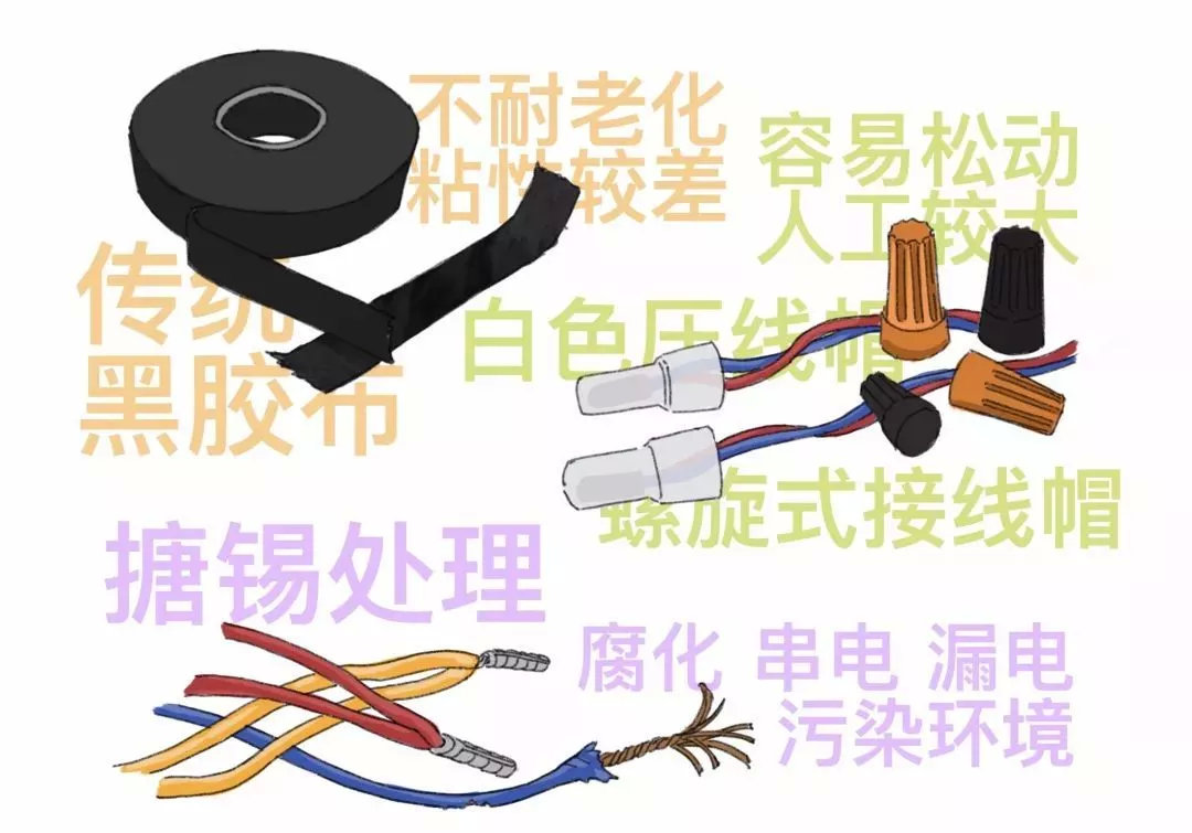 如果沒有一款先進(jìn)產(chǎn)品,那還要延續(xù)這種傳統(tǒng)的接線方式:黑膠布、白色壓線帽、螺絲釘連接、搪錫處理等。