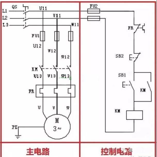 如上圖所示:QS代表電源開關(guān),F(xiàn)U代表保險(xiǎn)絲(熔斷器),F(xiàn)R代表熱保護(hù),SB代表按鈕開關(guān),KM代表接觸器,M代表電動(dòng)機(jī)。