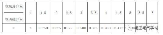 其中IQ為電機(jī)啟動(dòng)電流;In為電機(jī)的額定電流;C為系數(shù),電源總?cè)萘颗c電機(jī)總?cè)萘恐?。值?jiàn)下表:
