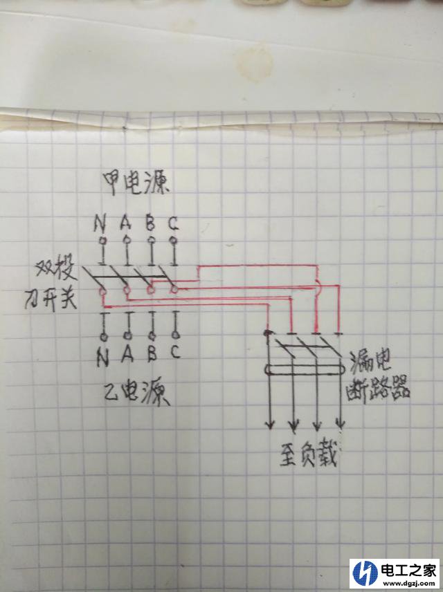 雙投刀開關(guān)中間位置的四個(gè)接線點(diǎn)、分別連接接至三極四線漏電斷路器的四個(gè)接線點(diǎn)。其具體連接如下圖;