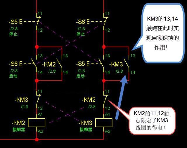 在這個電路圖中,S5按鈕和S6按鈕之間實現(xiàn)了電氣上的互鎖關(guān)系,就是S5按下的時候,S6所在的KM2回路必然會斷開!S6按鈕按下時,S5按鈕能啟動的KM3回路也必然會斷開!—這里的互鎖關(guān)系就是S5和S6不能同時被按下,一個動作會明確的限制另外一個的動作!