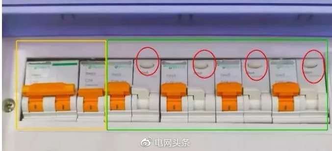 ▲如圖所示,紅色圈圈出來的就是漏保多的按鈕,綠色框線的四個支線安裝的是漏保,而黃色框線里的照明線路和總閘都是空開。