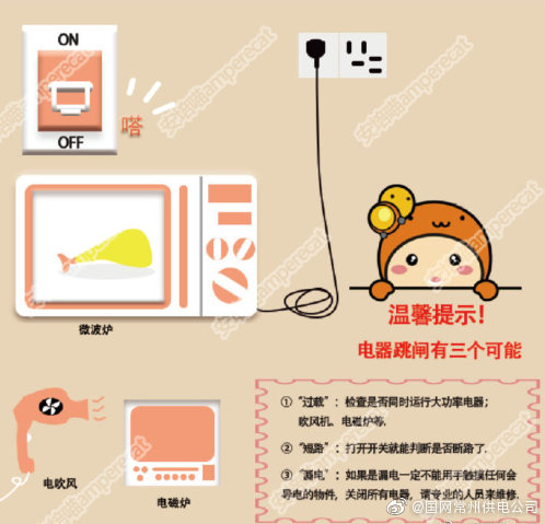電器跳閘有三個(gè)可能:過(guò)載、短路和漏電。過(guò)載指的是居民家電超負(fù)荷工作。居民可檢查家中是否還有其他大功率用電設(shè)備是否同時(shí)運(yùn)行。如果是微波爐是插上一段時(shí)間后再跳閘,基本可以排除短路可能。只要是電氣設(shè)備短路,在一開(kāi)機(jī)的時(shí)候就會(huì)跳閘。