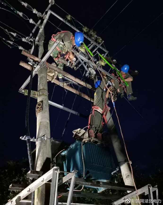 6月18日,來(lái)鳳縣遭遇暴雨,活水3隊(duì)因雷擊導(dǎo)致3號(hào)公變燒毀,國(guó)網(wǎng)來(lái)鳳縣供電公司運(yùn)維檢修部搶修人員在接到搶修信息后立即迅速趕赴現(xiàn)場(chǎng)。因運(yùn)輸車輛無(wú)法直接到達(dá),“電哥哥”只能靠肩挑背扛,一路披荊斬棘冒雨前行,終于將重約500公斤的變壓器扛至搶修現(xiàn)場(chǎng),經(jīng)過(guò)6小時(shí)雨夜鏖戰(zhàn),晚上11點(diǎn),順利恢復(fù)故障區(qū)域的供電。