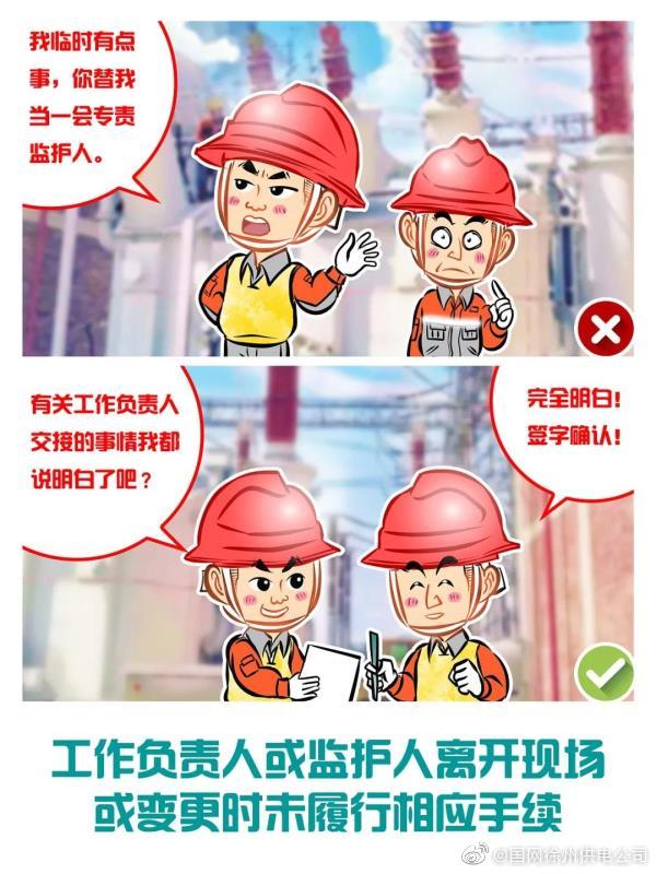 【電力施工安全反違章——工作負(fù)責(zé)人、專責(zé)監(jiān)護(hù)人離開工作現(xiàn)場(chǎng)或變更時(shí)未履行相應(yīng)手續(xù)】專責(zé)監(jiān)護(hù)人需長(zhǎng)時(shí)間離開工作現(xiàn)場(chǎng)時(shí),應(yīng)由工作負(fù)責(zé)人變更專責(zé)監(jiān)護(hù)人,履行變更手續(xù),并告知全體被監(jiān)護(hù)人員。工作期間,工作負(fù)責(zé)人若需暫時(shí)離開工作現(xiàn)場(chǎng),應(yīng)指定能勝任的人員臨時(shí)代替,離開前應(yīng)將工作現(xiàn)場(chǎng)交待清楚,并告知全體工作班成員。原工作負(fù)責(zé)人返回工作現(xiàn)場(chǎng)時(shí),也應(yīng)履行同樣的交接手續(xù)。工作負(fù)責(zé)人若需長(zhǎng)時(shí)間離開工作現(xiàn)場(chǎng)時(shí),應(yīng)由原工作票簽發(fā)人變更工作負(fù)責(zé)人,履行變更手續(xù),并告知全體工作班成員及所有工作許可人。原、現(xiàn)工作負(fù)責(zé)人應(yīng)履行必要的交接手續(xù),并在工作票上簽名確認(rèn)。