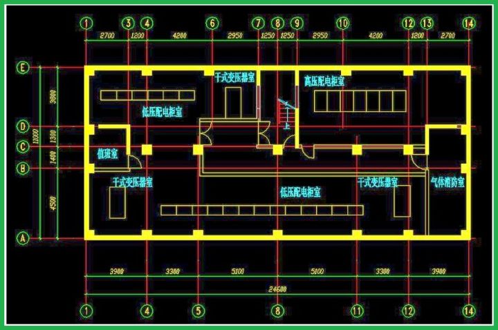 這是一個配電室平面圖,圖中黃色的是墻體和立柱。我們看到,干式變壓器和低壓開關(guān)柜共處一室,其實就是電力設(shè)備同處一室。這樣做好處是顯然的,相互之間的距離短了,電纜和母線橋架也短了,既節(jié)約了成本,有方便了維修和操作。