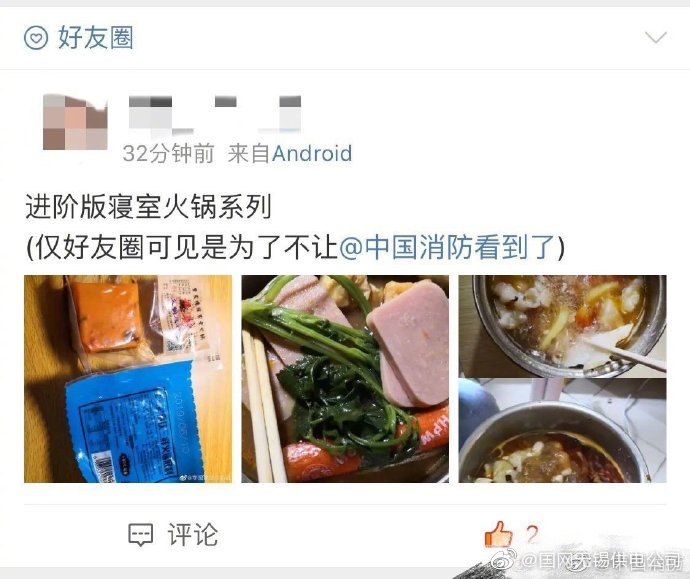 【在宿舍吃火鍋,想曬圖又怕被發(fā)現(xiàn),于是……】宿舍火鍋愛好者,為吃頓火鍋,也是煞費苦心!準備齊全后拍個照,發(fā)微博前先設(shè)個“僅好友圈可見”。喲喲喲,不被發(fā)現(xiàn)就是“安全”了?你的“圖一時之快”,可能換來的是一個宿舍,甚至一棟宿舍樓的“不安全”!引來電火得不償失。