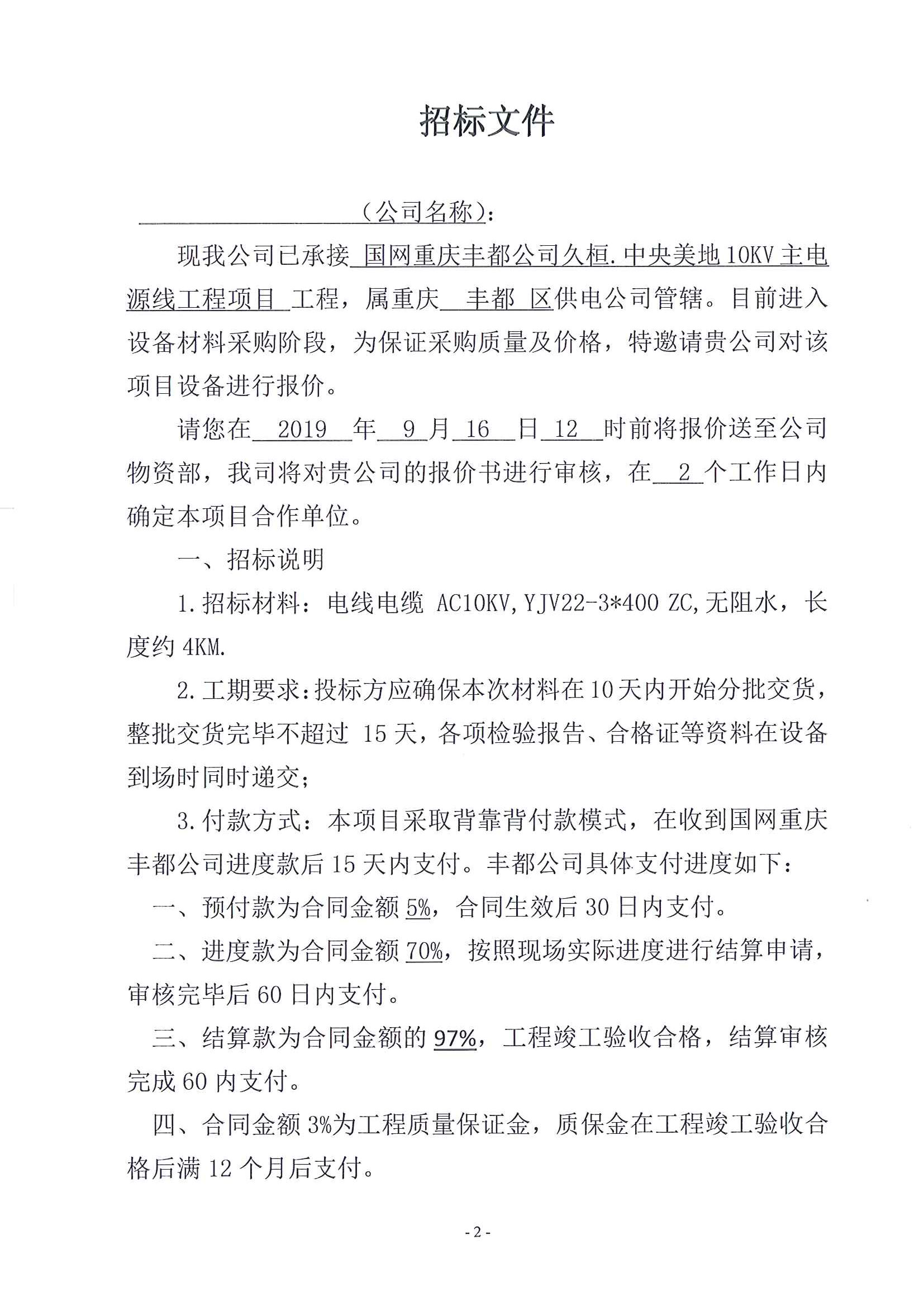 久恒-中央美地10KV工程電線電纜招標(biāo)