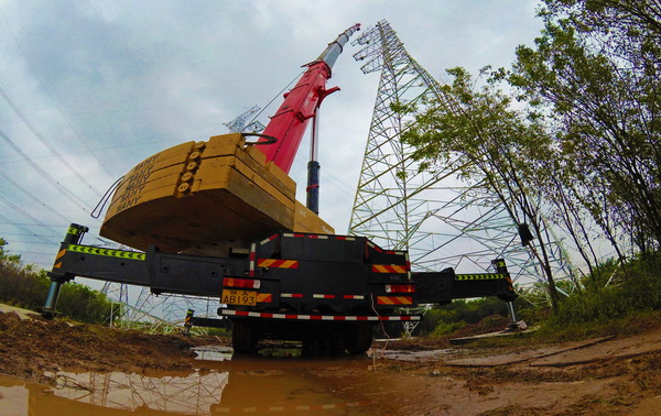 A42號鐵塔高85米,重116噸,停電后才能組立。為提高功效,項(xiàng)目部調(diào)用200噸吊車組立。現(xiàn)場泥濘濕陷,吊車進(jìn)不去,項(xiàng)目部又用水泵抽水,用60多塊鋼板鋪路,給吊車創(chuàng)造條件。