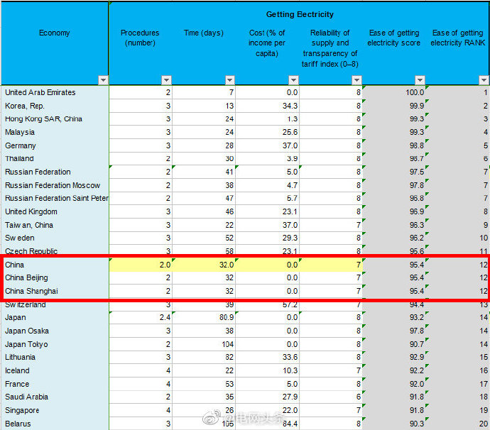 【中國目前在“獲得電力”方面全球排名第12,比去年上升2位】世界銀行于北京時間24日上午發(fā)布《全球營商環(huán)境報告2020》,報告顯示,中國在獲得電力方面全球排名第12,比去年上升2位,顯著好于東亞太平洋地區(qū)其他經(jīng)濟體。企業(yè)獲得電力時間指標(biāo)從去年起就成為中國營商環(huán)境全球領(lǐng)先的一大優(yōu)勢。 ????