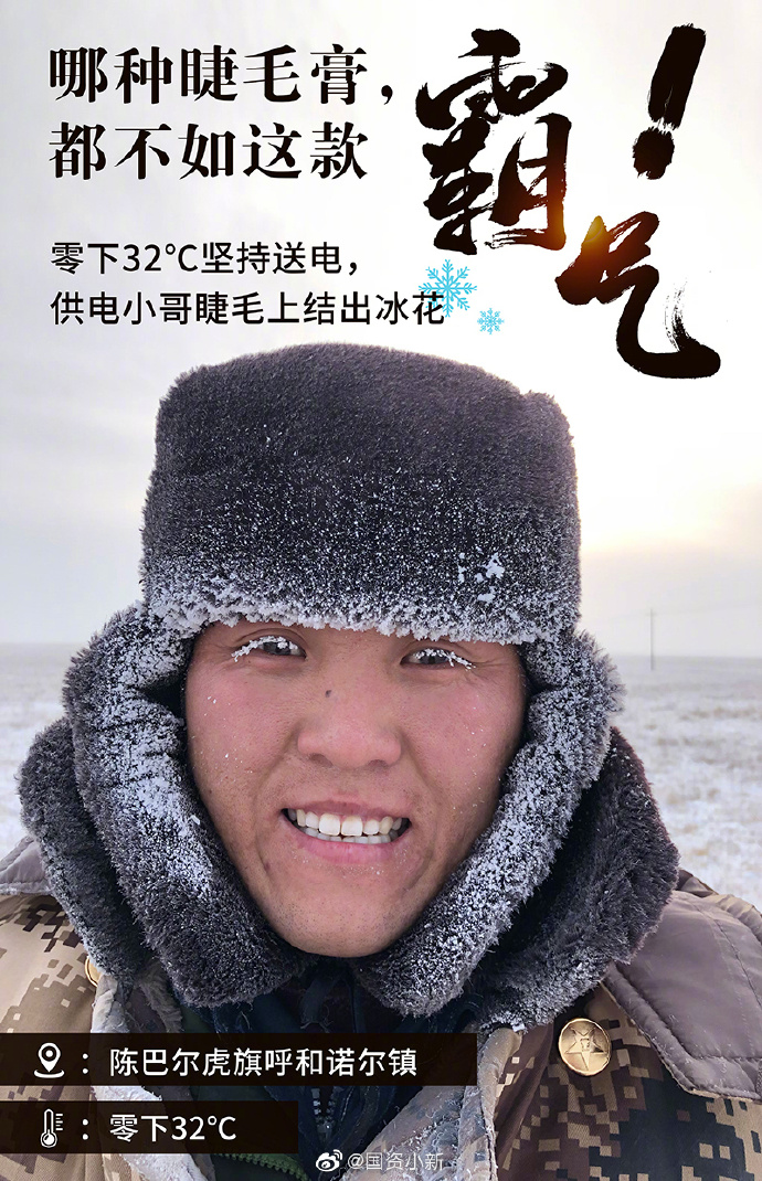 【哪種睫毛膏,都不如這款霸氣!】冬季,蒙東陳巴爾虎旗呼和諾爾鎮(zhèn)氣溫極低,是防寒保暖用電高峰。2019年12月29日,室外零下32攝氏度,寒風(fēng)凜冽,為了能給牧民及時(shí)送上電,供電員工爬上被積雪覆蓋的電桿,一干就是兩個(gè)小時(shí)。從電桿上下來時(shí),供電小哥的帽子、眉毛上都結(jié)了冰花。向寒冬中的工作者致敬,你們辛苦了!