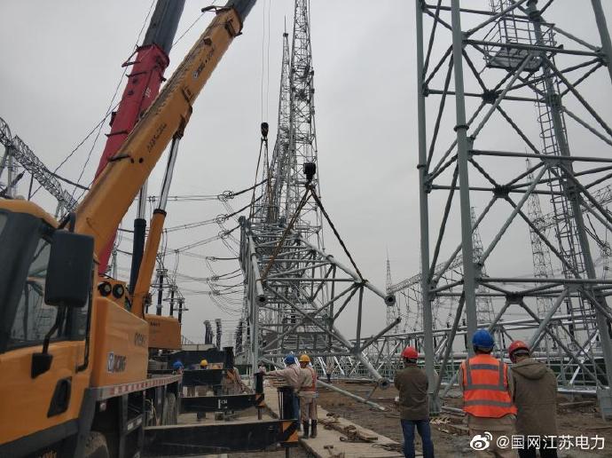 1月5日,在1000千伏東吳變電站江蘇側(cè)第三臺主變擴建工程施工現(xiàn)場,江蘇省送變電有限公司施工人員正按計劃進行1000千伏格構(gòu)式構(gòu)架吊裝工作。近日來蘇州地區(qū)連日陰雨,天氣陰冷潮濕,無形中增加了構(gòu)架吊裝難度。施工人員不畏嚴寒,利用雨停間隙順利完成1000千伏格構(gòu)式構(gòu)架柱吊裝,為后續(xù)構(gòu)架梁停電吊裝爭取寶貴時間。