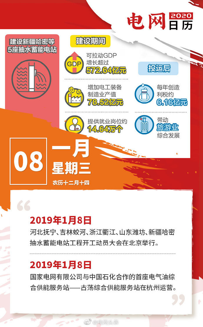 2019年1月8日,河北撫寧、吉林蛟河、浙江衢江、山東濰坊、新疆哈密抽水蓄能電站工程開(kāi)工動(dòng)員大會(huì)在北京舉行。2019年1月8日,國(guó)家電網(wǎng)有限公司與中國(guó)石化合作的首座電氣油綜合供能服務(wù)站——古蕩綜合供能服務(wù)站在杭州運(yùn)營(yíng)。 ????