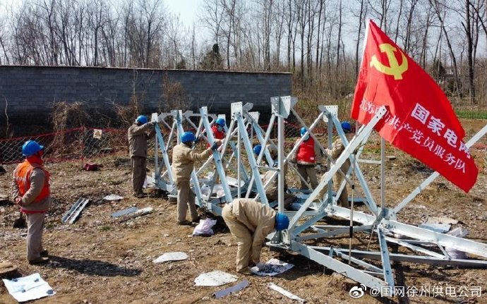 【加快35千伏艾柳線鐵塔組立“戰(zhàn)疫”】3月5日,國網(wǎng)江蘇省電力公司邳州市供電公司工程公司黨員突擊隊員李勇、張同軍和工友們在做好安全生產和疫情防控的措施下在35千伏艾柳線組立16號鐵塔。