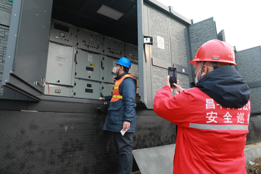國網(wǎng)北京昌平供電公司安全巡檢人員對北京小湯山醫(yī)院箱變進行巡視檢查。(閔政君)