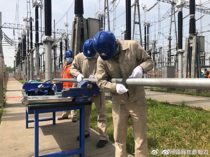 【變電站里忙碌的“小藍帽”】4月16日,國網(wǎng)江蘇檢修公司變電檢修中心修試四班員工在500千伏三汊灣變開展母線地刀放電異常處理工作。他們頭頂“小藍帽”,處理銹跡斑斑的刀閘機構,踐行“應修必修,修必修好”的工作態(tài)度,解除電網(wǎng)風險。 ????