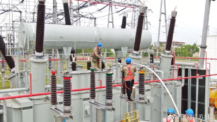 【電網(wǎng)增容擴(kuò)建助力地方經(jīng)濟(jì)發(fā)展】4月17日,在江蘇南通三官殿500千伏變電站主變?cè)鋈莨こ态F(xiàn)場(chǎng),江蘇省送變電有限公司施工人員正在安裝主變?cè)O(shè)備。本次擴(kuò)建將原有2臺(tái)750兆伏安主變?cè)鋈轂?000兆伏安,預(yù)計(jì)6月份投入運(yùn)行。運(yùn)行后將有效緩解現(xiàn)有主變供電壓力,滿(mǎn)足南通東南片區(qū)經(jīng)濟(jì)發(fā)展,大幅提升500千伏電網(wǎng)供電可靠性。