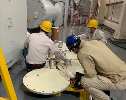 【技術(shù)把關(guān)嚴(yán)要求,細(xì)致排查保安全】5月10日,特高壓泰州換流站500千伏GIS絕緣拉桿更換工作正在全力開展。國網(wǎng)江蘇檢修公司變電中心修試三班工作人員嚴(yán)格按照檢修規(guī)程對重點(diǎn)工序進(jìn)行檢查,不放過任何一個(gè)缺陷,確保設(shè)備安全穩(wěn)定投運(yùn)。