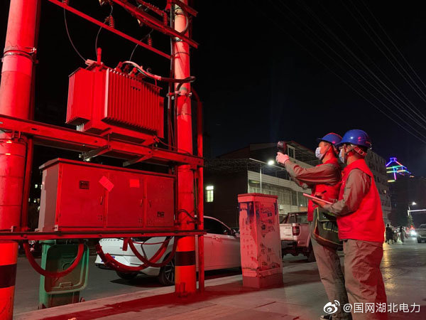 5月28日晚,國網(wǎng)竹溪縣供電公司鼓樓供電所員工手持紅外測溫儀,對東門街、南大街等多個配電臺區(qū)的變壓器、線路設備進行特巡和測溫“體檢”,防止設備“中暑”,助力客戶清涼度夏。
