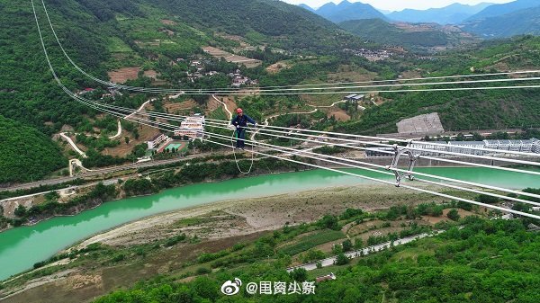 #央企復(fù)工者聯(lián)盟#?【看呆了電力工人飛躍嘉陵江,高空走鋼絲】隨著青?!幽稀?00千伏特高壓直流輸電線路工程陜西段貫通,這條綠色“空中走廊”實(shí)現(xiàn)全線貫通。6月14日,該工程陜I標(biāo)段進(jìn)入自檢驗(yàn)收階段。陜I標(biāo)段線路全長(zhǎng)64千米,共架設(shè)鐵塔102基,80%的鐵塔位于高山大嶺、20%位于一般山地,其中35號(hào)~37號(hào)鐵塔跨越寶成鐵路和嘉陵江,檔距長(zhǎng)度達(dá)1259米,是該標(biāo)段跨越難度最大的一段