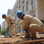 6月25日,中國農(nóng)歷傳統(tǒng)端午節(jié),在安徽省渦陽縣第二中學(xué)高考考點(diǎn),電力施工人員冒著高溫,加班加點(diǎn),為考場空調(diào)用電敷設(shè)專用電力線路。