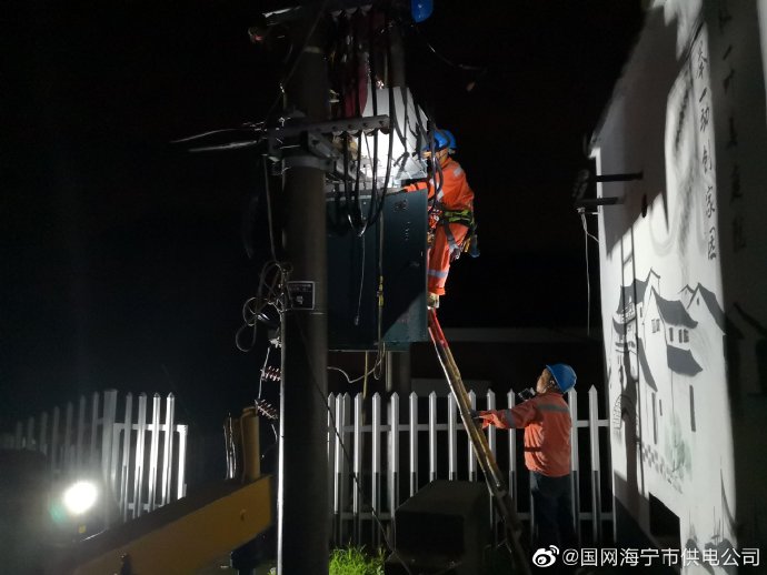 6月27日深夜10點多,在海寧市鹽官鎮(zhèn)萬壽村陳家木橋,3盞應急燈光束的匯聚下,國網海寧市供電公司鹽官供電所的搶修隊員還在緊張地進行變壓器固定和接線工作。夜深了,本來里三層外三層前來督戰(zhàn)的村民在得到“今夜可以通上電”的滿意答復后已陸續(xù)散去。