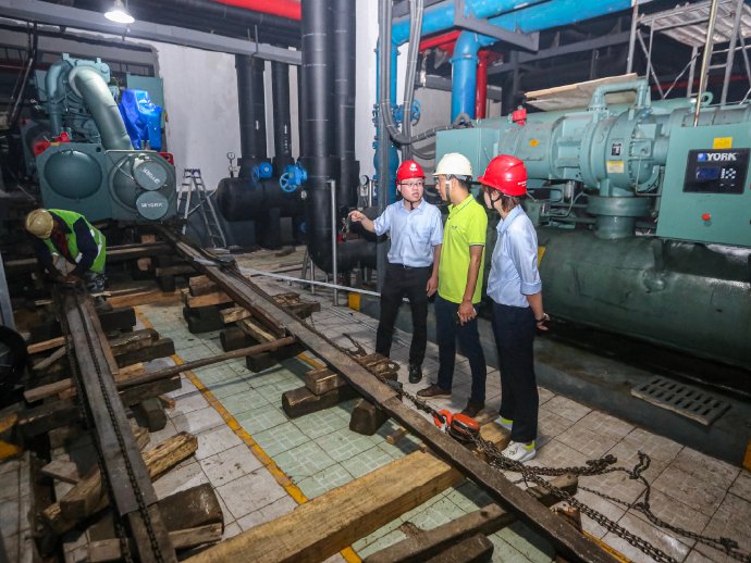 6月27日,國網(wǎng)寧波供電公司首個園區(qū)空調(diào)節(jié)能改造項目在銀晨國際大廈地下室內(nèi)順利竣工。由于運行年數(shù)已久,銀晨國際大廈園區(qū)內(nèi)的空調(diào)系統(tǒng)水管管路及其保溫部分明顯破損,水泵、冷卻塔等設備有故障,制冷效果差,能耗壓力大。為積極響應政府提出的“節(jié)能降耗”、“能源雙控”工作要求,進一步推動綠色建筑行動,國網(wǎng)(寧波)綜合能源服務有限公司定制采用合同能源管理模式的節(jié)能改造方案,通過對中央空調(diào)系統(tǒng)的節(jié)能改造及智控管理,大幅降低用戶能耗。趁著端午假期,該公司加班加點對園區(qū)內(nèi)的空調(diào)系統(tǒng)進行了改造升級,全力保障銀晨國際園區(qū)內(nèi)租戶能度過清涼一夏。