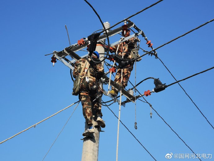 秋高氣爽碧空藍(lán),辛勤作業(yè)登高桿,齊心協(xié)力架線忙,電網(wǎng)升級保供電。10月15日,國網(wǎng)定州市供電公司工作人員,在10千伏堯方頭561線路升級電網(wǎng)、立桿架線,提升電網(wǎng)運(yùn)行水平,全力保障客戶安全可靠供電。(張鵬飛 邸樹成) ????