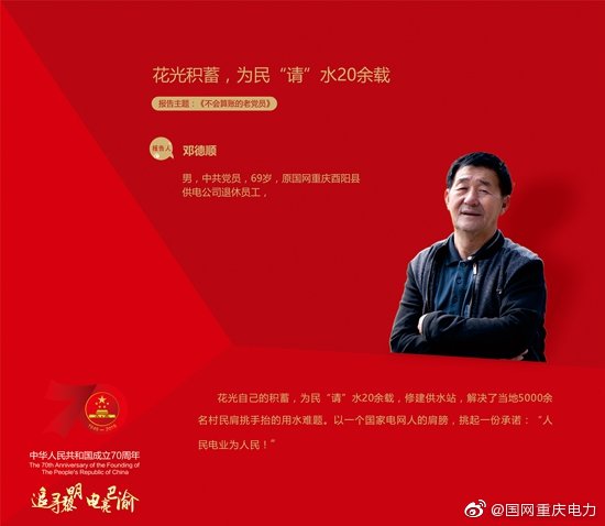 36年前,鄧德順成為酉陽縣供電公司的一名駕駛員,勤勞能干,業(yè)余時間去打鐵、理發(fā)、跑運輸,很快就攢下一筆存款,如果故事就這樣發(fā)展下去,鄧德順現(xiàn)在的生活會是富足又安逸的。但在1997年春節(jié),一塊兒長大的村民石邦祿挑水摔折了腿,讓鄧德順惦記起還吃不起自來水的鄉(xiāng)親們,他認識到如果說自己這些年都是在被別人幫助,在積蓄能量,那這時也到了自己發(fā)光發(fā)熱,去幫助別人的時候了。說干就干,鄧德順立馬就張羅著買管道修水站,下定決心要解決家鄉(xiāng)吃水難問題。這一干,就是二十多年,鄧德順投進去了400萬,光是管道就換了三次,從小管到大管,從易腐蝕的鐵管到夠堅固的膠管……從小有積蓄到賣掉房子還欠下外債,這筆賬鄧德順都不想算。如今,水站運作上了軌道, 4000多人的吃水問題解決了。老黨員鄧德順還是不算賬。水費按戶收,一年只收120,孤寡老人、貧困戶、退伍軍人家庭水費全免,而每年光維修維護費用就得一萬多, 所以2010年退休后鄧德順就干脆搬回村里來自己搞維護。鄧德順總覺得,這就是自己作為一個老黨員責無旁貸的使命,覺得這件事就應(yīng)該由自己擔當起來。如今,他還在盤算著招商引資讓家鄉(xiāng)甘甜的純凈水成為產(chǎn)品,走出高莊村,給村民們帶來更多的就業(yè)機會和經(jīng)濟收入。從自發(fā)到自覺,從受助到助人,從蓄電到發(fā)電,談起這些年的付出,鄧德順的話很樸實:這就是一個共產(chǎn)黨員應(yīng)該做的。