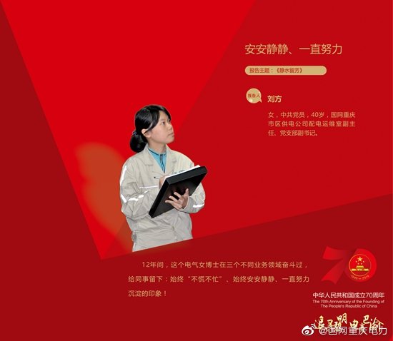 劉方,電力專業(yè)女博士,國網(wǎng)重慶市區(qū)供電公司配電運檢室主持工作的副主任和主持黨務(wù)工作的黨支部副書記——重慶市“五一勞動獎?wù)隆鲍@得者,國家電網(wǎng)公司勞動模范、劉方勞模工作室領(lǐng)軍人物。從調(diào)控中心到運維檢修部、發(fā)展策劃部,到再回配電運檢室。12年間,劉方在三個不同業(yè)務(wù)領(lǐng)域奮斗過,她帶領(lǐng)團(tuán)隊在三個月內(nèi)完成了總計60多個變電站的整合調(diào)試,參與推動了來福士廣場的朝天門變電站聯(lián)建實現(xiàn)政府、企業(yè)、居民的三贏,在工作中她給同事留下始終“不慌不忙”、始終安安靜靜、一直努力沉淀的印象。因為專業(yè),所以專注;因為專注,所以安靜,芳華自開。