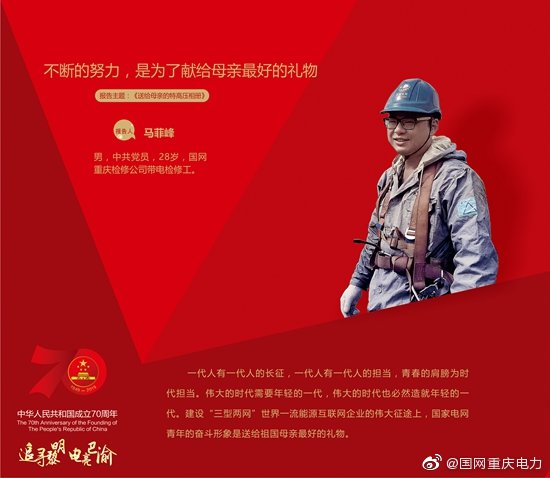 從事高壓輸電線路帶電檢修工作的28歲的馬菲峰是一個(gè)90后,日常工作場(chǎng)景都是在數(shù)十米高的鐵塔上,但第一次登塔他就慫了,他雙眼緊閉抱緊鐵塔上的橫擔(dān),說(shuō)什么也不肯松開,師兄拍下了這尷尬的一幕并發(fā)給了他。他媽媽看見照片后說(shuō),峰啊,你爬塔的時(shí)候,把媽媽的心也帶上去了呀!但馬菲峰沒(méi)有退縮,在師傅和師兄們的幫助下,全力克服著自己對(duì)于高處的恐懼,每一次都進(jìn)步一點(diǎn)點(diǎn)。漸漸的,他愛(ài)上了那種將大地甩在身后,登塔遠(yuǎn)眺的感覺(jué)。站在鐵塔之巔,俯瞰祖國(guó)壯麗山河,聆聽電流聲與鳥鳴交織成的美妙協(xié)奏曲,欣賞茂密山林間砍柴山民矯健的步伐,每一幕都是風(fēng)景。他把這一切都記錄在一本相冊(cè)里送給媽媽,將心底的千言萬(wàn)語(yǔ)匯成了相冊(cè)里唯一的一句話:“媽媽,天空很美,我想帶您去看看不一樣的風(fēng)景?!彪S著技能水平的不斷提升,他逐漸能夠勝任500千伏帶電作業(yè),那是更高的天空,是更加壯闊的畫面,拍下了更多美麗的照片,把它們放進(jìn)了相冊(cè)里。不知不覺(jué)給媽媽的照片已經(jīng)裝滿三本相冊(cè)了,相冊(cè)里的照片越來(lái)越豐富,有半山腰上農(nóng)家的裊裊炊煙,也有曠野中篝火的熊熊燃燒;有鐵塔之巔迎來(lái)的第一縷陽(yáng)光,也有返程路上送走的最后一道夕陽(yáng)。現(xiàn)在,他還要沿著4.5萬(wàn)公里的特高壓輸電線路,走遍祖國(guó)的每一個(gè)角落,還想沿著“一帶一路”走出國(guó)門,去領(lǐng)略狂熱的桑巴風(fēng)情,去聆聽尼羅河古老的傳說(shuō)。馬菲峰要拍下更多更漂亮的照片,送給最親愛(ài)的媽媽,送給最親愛(ài)的——祖國(guó),母親。