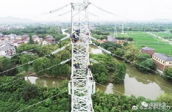 國(guó)網(wǎng)杭州市余杭區(qū)供電公司員工在瓶窯鎮(zhèn)110千伏柏廟輸變電工程施工現(xiàn)場(chǎng)展放導(dǎo)線..