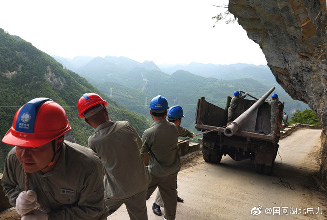 【電線桿過(guò)“關(guān)”記】8月1日,國(guó)網(wǎng)建始縣供電公司龍坪供電所員工在龍坪鄉(xiāng)野果寨村轉(zhuǎn)運(yùn)網(wǎng)改物資材料。建始縣龍坪鄉(xiāng)野果寨村一處公路有近500米路段是在絕壁上開(kāi)鑿而成,公路上方突兀伸出的絕壁與路面垂直距離僅3米左右,農(nóng)用車?yán)?米長(zhǎng)水泥電桿無(wú)法通過(guò),工人們只好徒手將電桿卸下,再用人力推車轉(zhuǎn)運(yùn)到作業(yè)點(diǎn)。