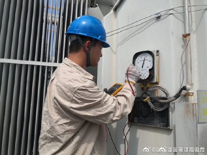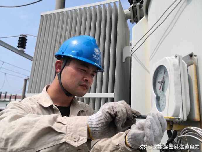 【幫助“高燒”設備“退燒”】8月8日,國網(wǎng)灌南縣供電公司運維站人員正頂著熱浪,對油溫異常告警的35千伏百祿變電站主變進行處理,更換油溫過高的輔助接點,保障設備安全穩(wěn)定運行。 ????