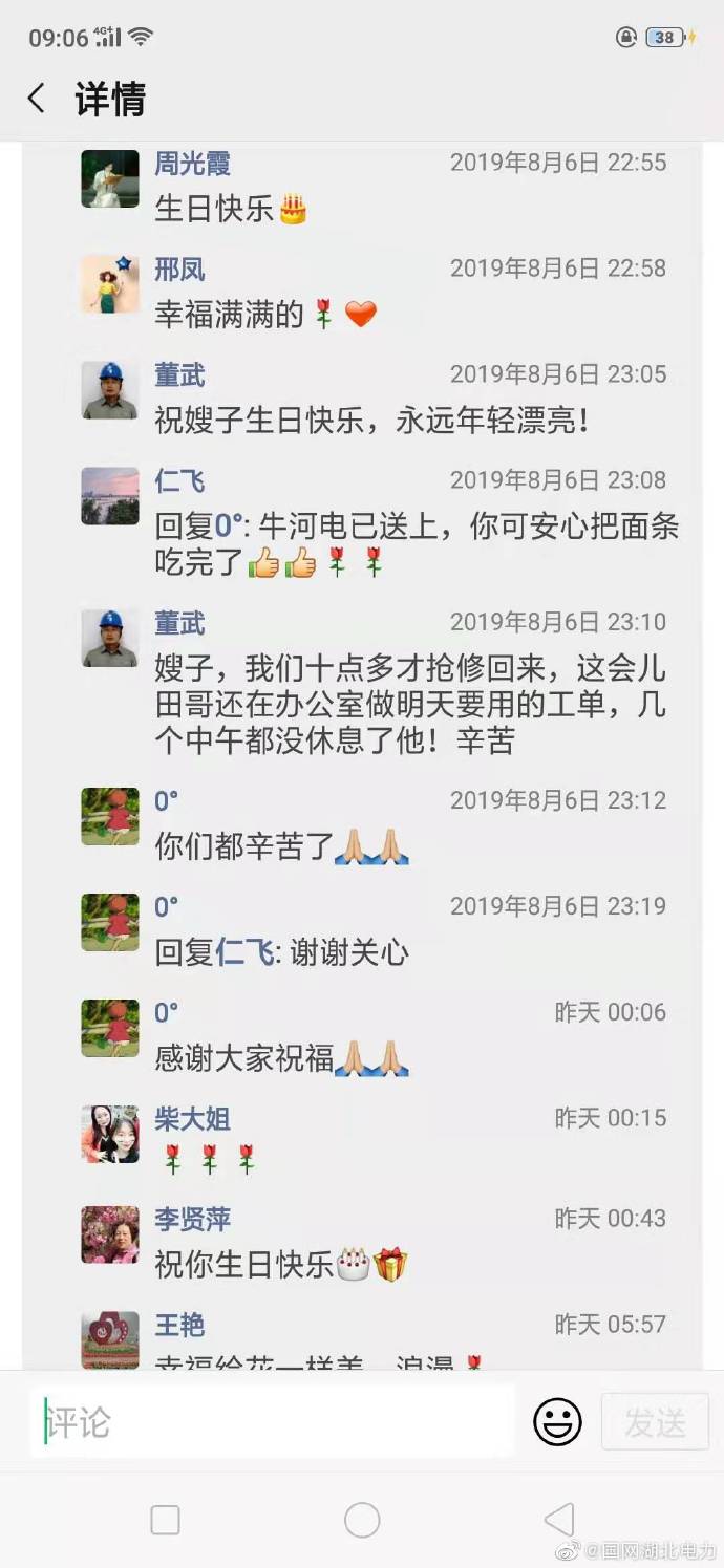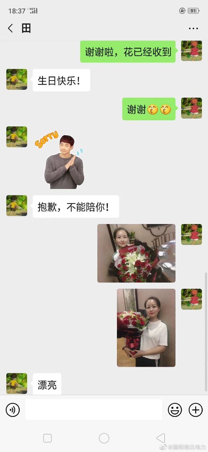 【當(dāng)妻子生日遭遇搶修】8月6日,國網(wǎng)丹江口市供電公司均州供電所員工胡菁收到一束嬌艷欲滴的玫瑰花,原來當(dāng)天是她的生日!當(dāng)她欣喜地感嘆老公“懂板”時(shí),卻收到遠(yuǎn)在牛河供電站丈夫田金安的道歉微信。當(dāng)日,暴雨襲擊了整個(gè)丹江口市,在牛河供電站值班的丈夫正忙著搶修,無法趕回來給妻子過生日,只能簡單地在微信上告訴妻子。同為電力職工的胡菁不生氣,她明白,每一家的燈火通明,都有著電網(wǎng)職工的守護(hù)。