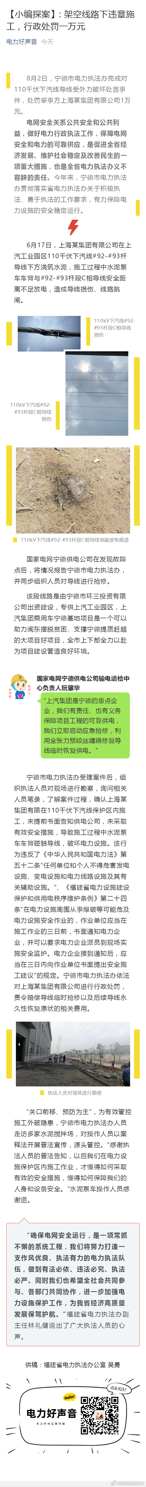 【架空線路下違章施工,行政處罰一萬元】電網(wǎng)安全關(guān)系公共安全和公共利益,做好電力行政執(zhí)法工作,保障電網(wǎng)安全和電力的可靠供應(yīng),是促進全省經(jīng)濟發(fā)展、維護社會穩(wěn)定及改善民生的一項重大措施,也是全省電力執(zhí)法辦義不容辭的責(zé)任。今年來,寧德市電力執(zhí)法辦貫徹落實省電力執(zhí)法辦關(guān)于積極執(zhí)法、勇于執(zhí)法的工作要求,有力保障電力設(shè)施的安全穩(wěn)定運行。