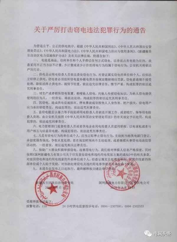 為營(yíng)造公平、公正的供電秩序,根據(jù)《中華人民共和國(guó)刑法》、《中華人民共和國(guó)治安管理處罰法》、《中華人民共和國(guó)電力法》、《中華人民共和國(guó)電力供應(yīng)與使用條例》、《新疆維吾爾自治區(qū)電力設(shè)施保護(hù)辦法》及有關(guān)法律法規(guī),特通告如下: