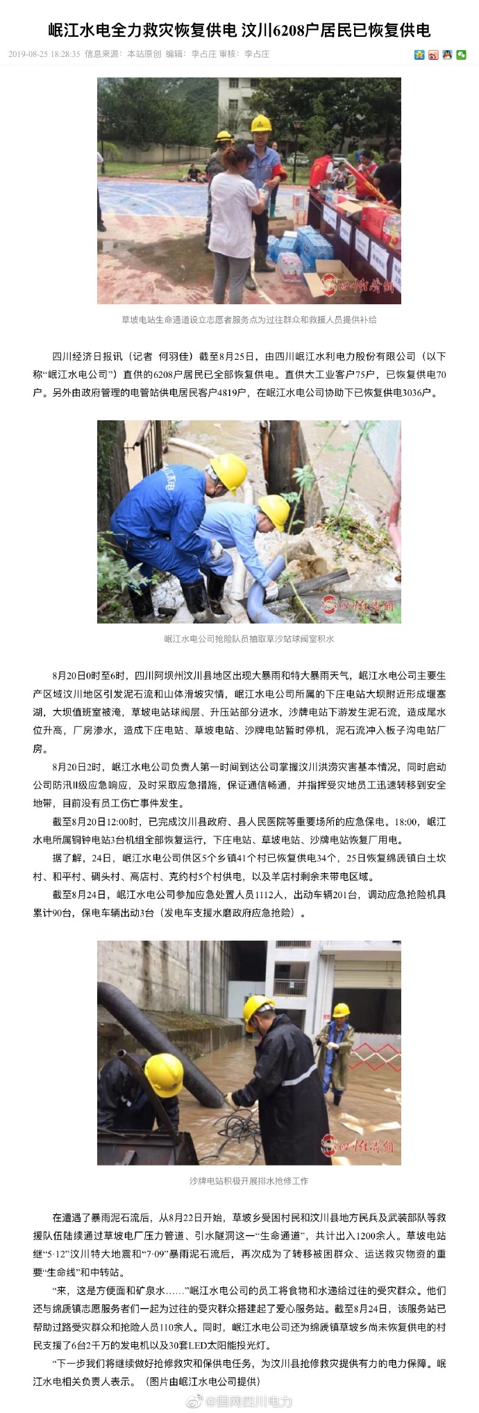 發(fā)布時(shí)間:2019/08/26 行業(yè)新聞 標(biāo)簽:四川岷江水利電力股份有限公司救災(zāi)恢復(fù)供電瀏覽次數(shù):2273