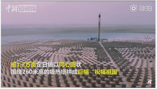 【震撼!戈壁灘上1.2萬面定日鏡拼出巨幅祝福祖國】近日,甘肅敦煌100兆瓦熔鹽塔式光熱發(fā)電站場(chǎng)區(qū)內(nèi),逾1.2萬面定日鏡,以同心圓狀圍繞260米高的吸熱塔,拼成巨幅“祝福祖國”!據(jù)悉,這是全球聚光規(guī)模最大、可24小時(shí)連續(xù)發(fā)電的100兆瓦級(jí)熔鹽塔式光熱電站。網(wǎng)友:祝福我的祖國,為阿中哥打CALL!