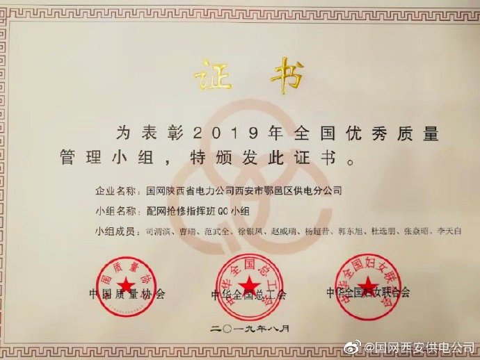 【鄠邑:全國優(yōu)秀QC小組在省2019“質(zhì)量月”活動(dòng)啟動(dòng)會(huì)成功展演】9月5日,國網(wǎng)西安市鄠邑區(qū)供電公司榮獲中國質(zhì)量協(xié)會(huì)、中華全國總工會(huì)2019年全國優(yōu)秀質(zhì)量管理小組開展的《提高95598停電信息信息報(bào)送完整率》QC課題,在陜西省2019“質(zhì)量月”活動(dòng)啟動(dòng)儀式暨質(zhì)量提升推進(jìn)會(huì)上進(jìn)行展演。近兩年,鄠邑公司根據(jù)實(shí)際情況先后注冊(cè)了5個(gè)課題,所選課題都是針對(duì)基層班組安全運(yùn)行、經(jīng)營(yíng)管理中存在的問題進(jìn)行質(zhì)量改進(jìn),使其真正起到解決實(shí)際問題,提高效益的作用。