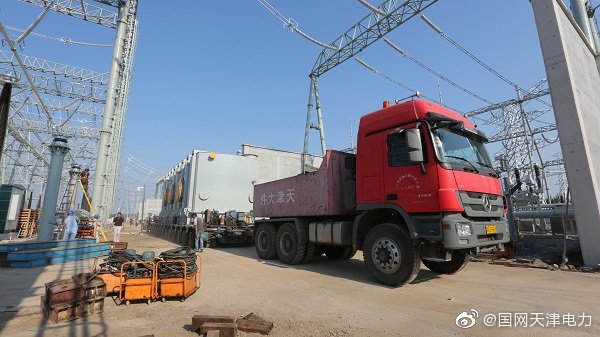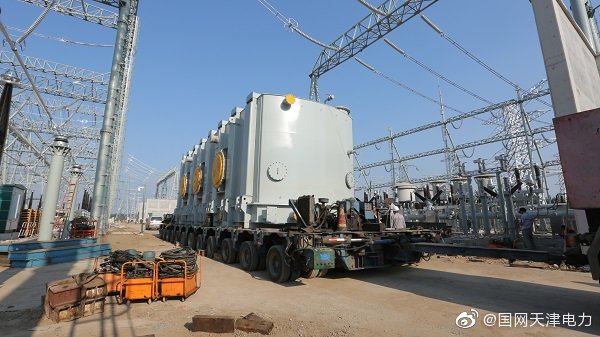 國網(wǎng)天津建設公司:天津渠陽(寶北)500kV變電站工程首臺三相一體500千伏主變壓器順利上臺就位
