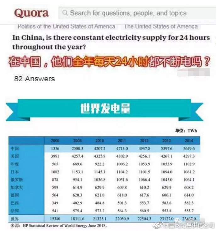有位印度網(wǎng)友在外國(guó)知乎發(fā)問(wèn)“中國(guó)全年24小時(shí)都不斷電嗎”?網(wǎng)友表示“好久沒體驗(yàn)停電的感覺了”。隨著國(guó)家電網(wǎng)積極建設(shè)及西電東送、南北互供等,全國(guó)聯(lián)網(wǎng)格局基本形成,連續(xù)超越發(fā)達(dá)國(guó)家,2011年發(fā)電就成為了世界第一