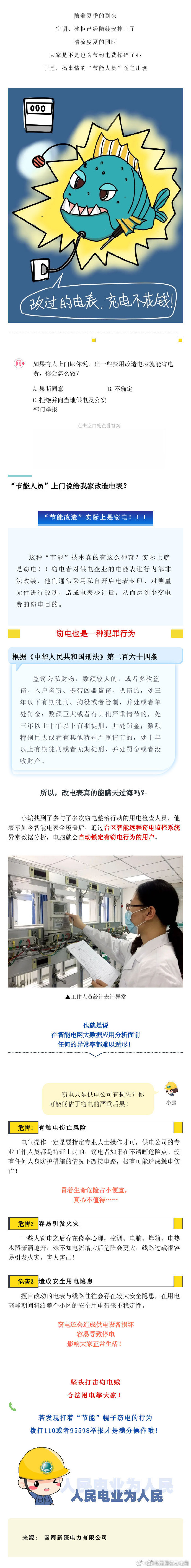 隨著夏季的到來,空調(diào)、冰柜已經(jīng)陸續(xù)安排上了,清涼度夏的同時,大家是不是也為節(jié)約電費操碎了心,于是,搞事情的“節(jié)能人員”隨之出現(xiàn)?!肮?jié)能人員”上門說給你家改造電表?這種“節(jié)能”技術真的有這么神奇?實際上就是竊電!! ????