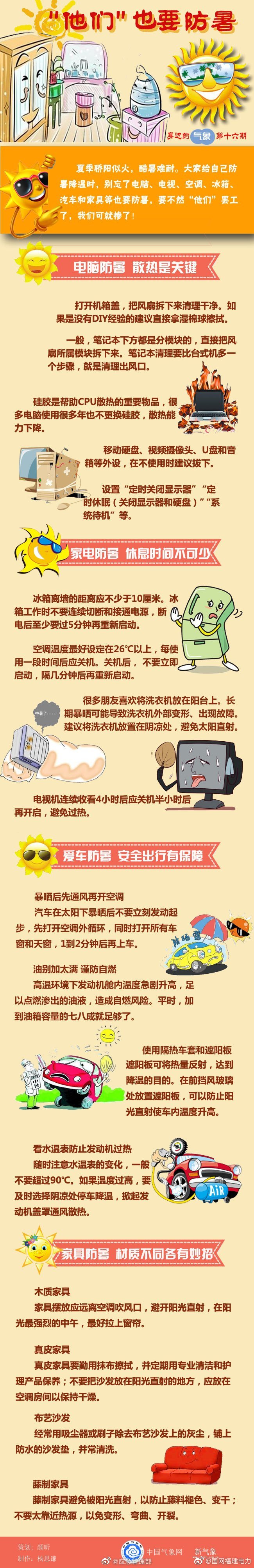 夏季驕陽似火,酷暑難耐。大家給自己防暑降溫時,別忘了電腦、電視、空調(diào)、冰箱、汽車和家具等也要防暑,否則會埋下消防安全隱患,引發(fā)事故發(fā)生。